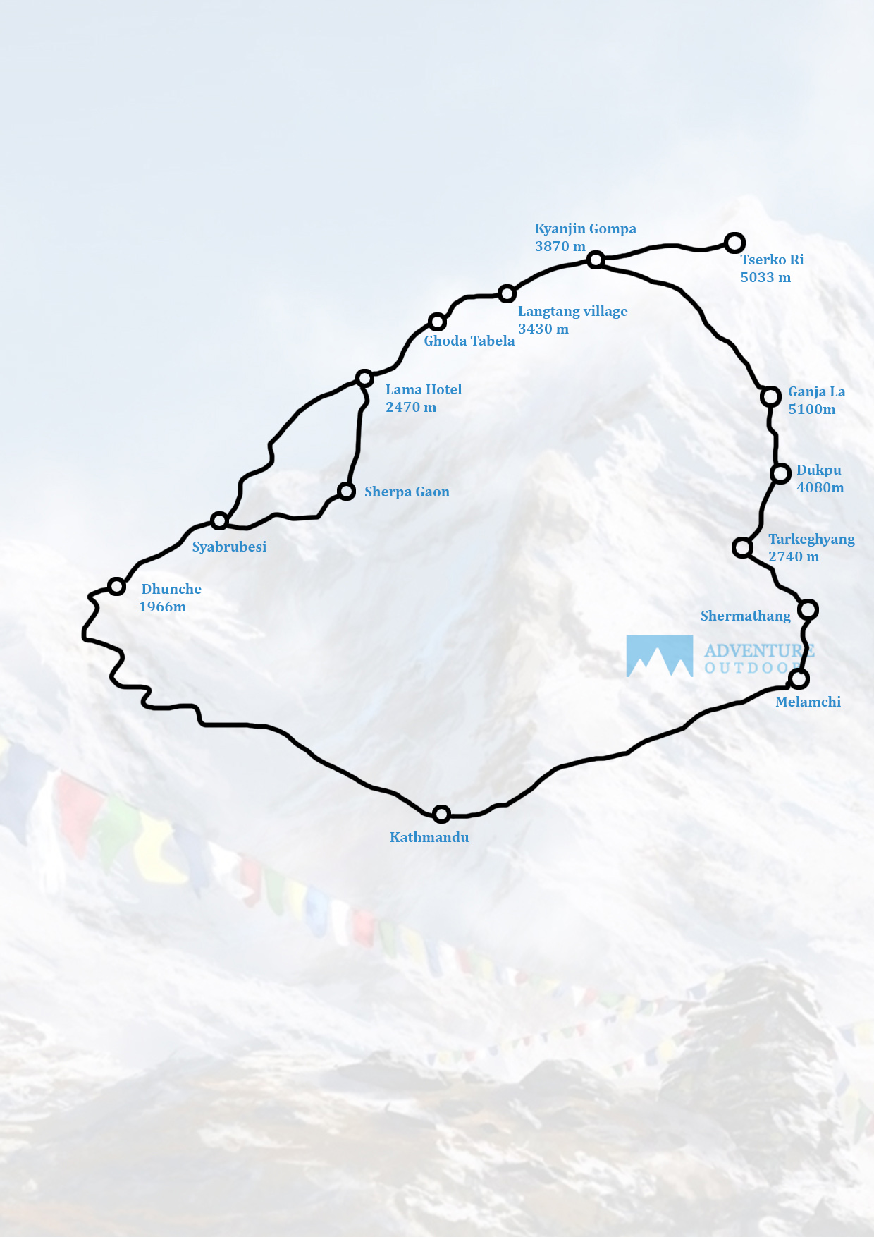 After conquering the Ganjala Pass, the trail leads to Malemchi Gaon, Tarke Ghyang, and eventually descends to Melamchi Khola. From there, trekkers return to Kathmandu via Sundarijal.